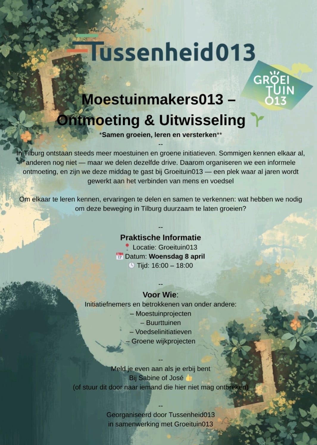 Tussenheid013 organiseert op 8 april a.s. een informele ontmoeting op GroeiTuin013 van 16.00 tot 18.00 uur. Hein van den Hurk zal alle aanwezigen ontvangen als gastheer.