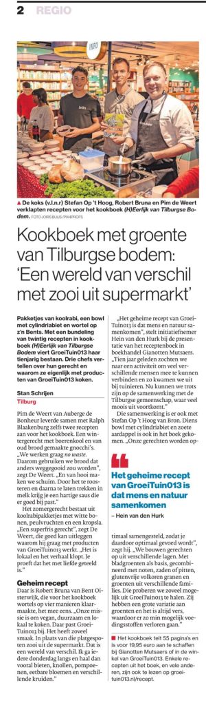 Pakketjes van koolrabi, een bowl met cylindriabiet en wortel op z’n Bents. Met een bundeling van twintig recepten in kookboek (H)Eerlijk van Tilburgse Bodem viert GroeiTuin013 haar tienjarig bestaan. Drie chefs vertellen over hun gerecht en waarom ze eigenlijk met producten van GroeiTuin013 koken. “Je proeft dat het met liefde geteeld is!”