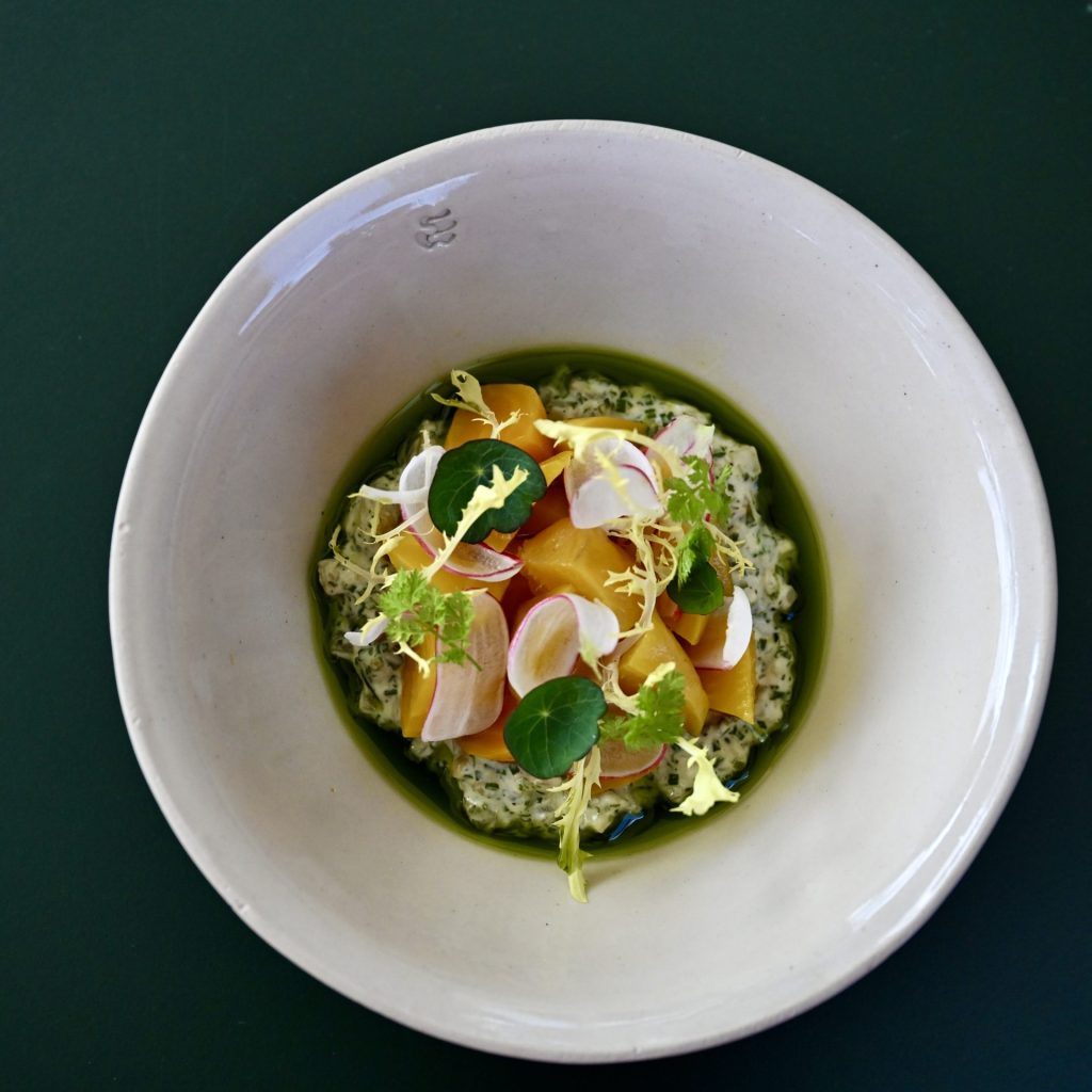 - Schep de remoulade in een bordje en maak de stukjes gele biet aan met een beetje olijfolie en peper en zout.