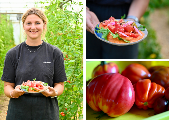 - Snijd een kruisje in de onderkant van de tomaten en verwijder de harde kern. Leg ze op een bakplaat samen met de halve bol knoflook (in schil).