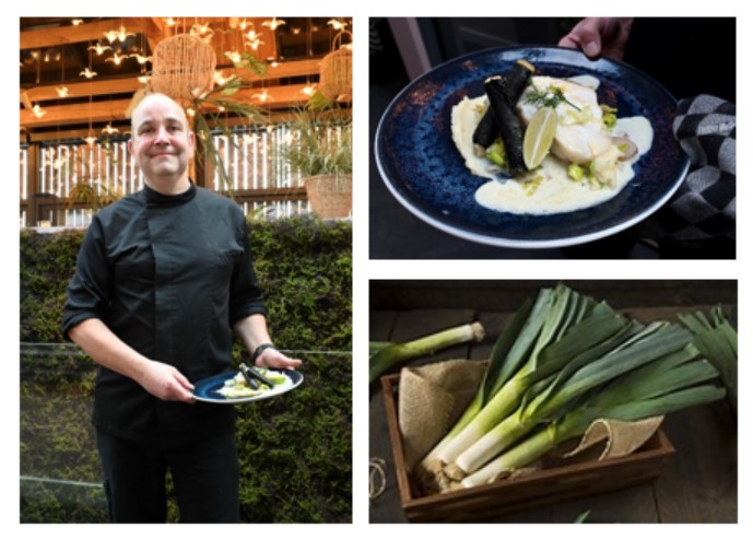 Leg de Skrei op een snijplank en doe er zout en peper op. Verwarm de oven voor op 160 graden. Snijd het groen van de prei, en snijd stukken van circa 15 cm. Maak goed schoon en kerf met een mes sneetjes in de bovenkant.