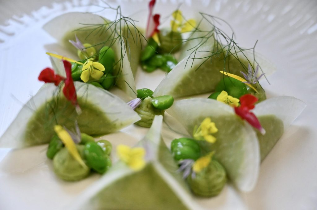 Vul de koolrabi rondjes met witte bonencrème. Vouw de pakketjes dicht zodat je een driehoek krijgt. Leg 5 pakketjes mooi op het bord en verdeel de aangemaakte doperwten en tuinbonen er omheen. Schenk de dressing in het midden van het bord en maak het af met kruiden pluksels.