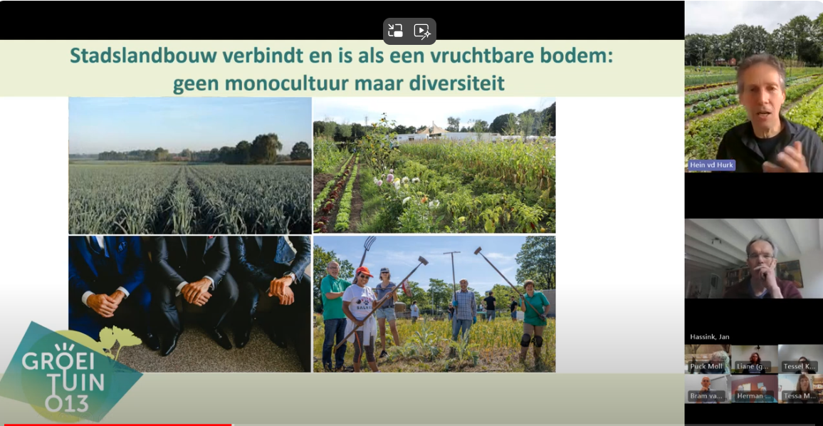 Na een introductie over dit thema door Bram van Helvoirt (onderzoeker en docent aan de HAS Hogeschool en betrokken bij het NWA-programma ‘Transitie naar een duurzaam voedselsysteem’) vertelden Hein van den Hurk en andere sprekers over hun rol in de transitie naar een duurzaam voedselsysteem en hoe zij de impact van sociale voedselgemeenschappen versterken. Hein van den Hurk benadrukte de waarde van dit soort initiatieven voor de samenleving en hij vertelde o.a. hoe natuurlijke groeiprocessen in een moestuin een metafoor zijn voor gezonde ontwikkeling van mens en maatschappij.
